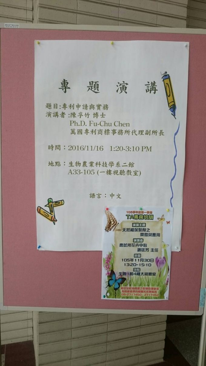本所陳孚竹副所長於11月16日至嘉義大學進行專題演講,本次講題為「專利申請與實務」。